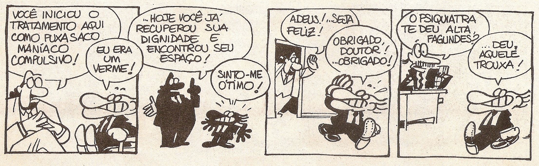 No que diz respeito ao acidente, contei resumidamente o que aconteceu e lhe garanti que foi a única recaída do mês. Mentira. Foi a oitava. Mas como as sete anteriores foram “bem de leve” não achei relevante trazer o assunto à pauta. O que, na hora, me fez lembrar dessa tirinha do Fagundes, o Puxa-Saco, personagem do Laerte:
