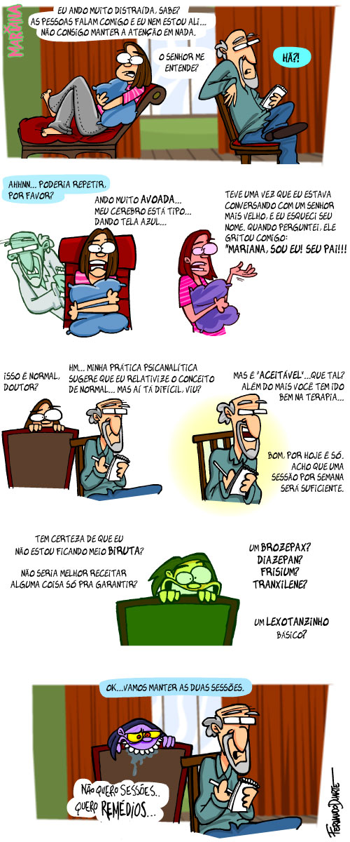 Só que, no meu caso, não tive “alta”. Muito pelo contrário. Na realidade ele resolveu AUMENTAR a dosagem de um dos remédios que estou tomando. Tá, o médico é ele, então deve saber o que está fazendo. Mas, sinceramente, não me sinto “depressivo”. O que me fez lembrar outra tirinha (tudo me faz lembrar alguma tirinha), desta vez da Mariana e da Cláudia…