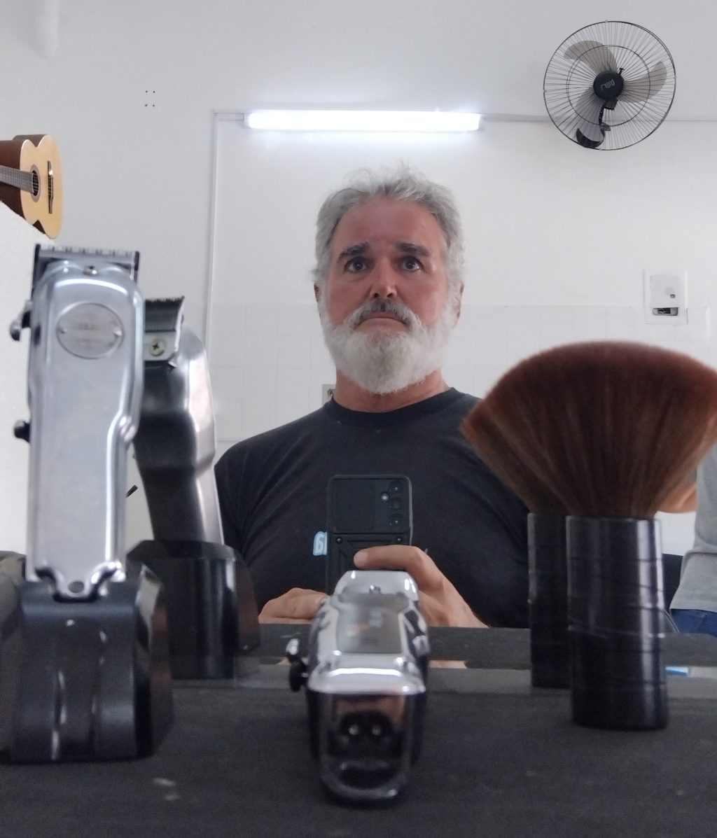 Ah, já estava quase me esquecendo: a minha querídola, amada, idolatrada, salve, salve, Dona Patroa – que, por incrível que pareça tem me tratado como uma pessoa normal, apesar de eu ter certeza que de normal não tenho nada – resolveu comentar comigo, antes ainda de eu sair pra rua, que eu estava precisando cortar o cabelo e aparar a barba, mas lamentou que estava estava sem tempo pra isso (é ela que tem me dado um trato desde a pandemia).